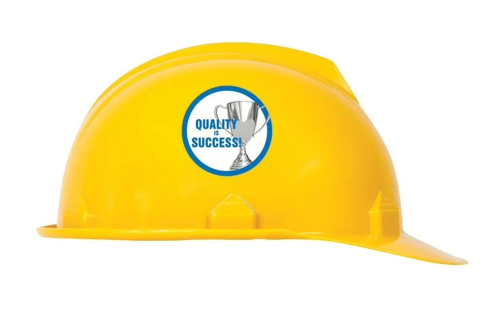 Details: AccuformNMC LHTL162 Hard Hat Stickers, Quality Is Success, Adhesive Vinyl, 2-1/4", 10/Pk