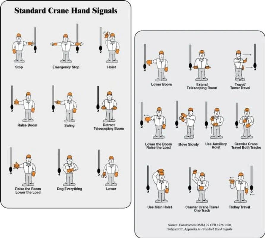 Includes the Standard Hand Signals as outlined in 29 CFR Part 1926 Cranes and Derricks in Construction Final Rule - released in 2010.