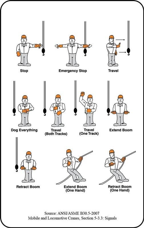 • Clearly demonstrates proper hand gestures for directing mobile cranes