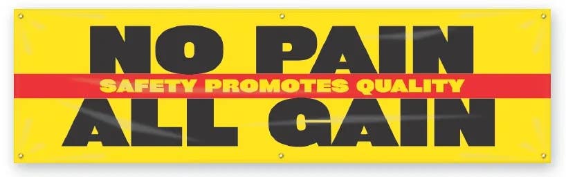 Details: AccuformNMC MBR921 Safety Banners, No Pain, All Gain, Safety Promotes Quality, 28" H x 8' W
