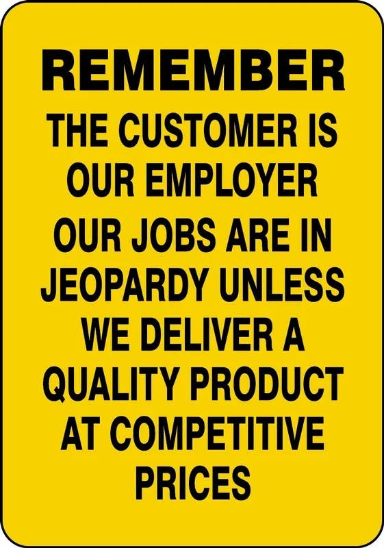 • THE CUSTOMER IS OUR EMPLOYER OUR JOBS ARE IN JEOPARDY UNLESS WE DELIVER A QUALITY PRODUCT AT COMPETITIVE PRICES