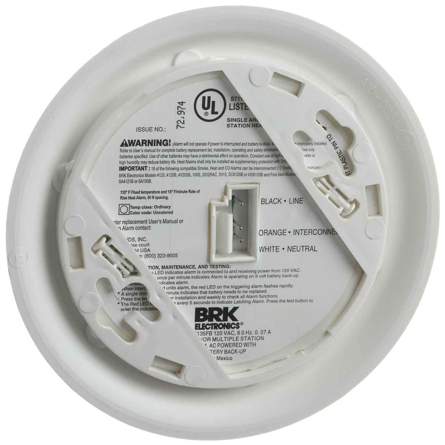 This First Alert HD6135FB Hardwired Heat Alarm is a great add-on for crawl spaces, laundry rooms, garages, bathrooms, kitchens, or other applications not suitable for smoke alarm installations. This heat alarm features advanced rate-of-rise sensing technology. The alarm sounds if either the temperature reaches 135° F or if the temperature rises more than 15° F in one minute. The First Alert BRK Brands Hardwired Heat Alarm with Battery Backup is a performance rich solution that includes numerous safety enhancers to ensure the maximum in overall protection. First Alert BRK Brands Hardwired Heat Alarms feature a near effortless installation process and are easily maintained. The utilization of rate-of-rising temperature sensing and a microprocessor that drastically reduces the number of nuisance alarms make this an ideal addition for any number of settings. A test/silence button and low battery warning have also been included to ensure the maximum in peace of mind. This alarm can also be interconnected with up to 12 other compatible smoke alarms and six compatible devices that include: bells, horns, repeaters and door closers. Should one unit trigger an alarm, all of the smoke alarms in the series will alert your surroundings. A power indicator will reveal which alarm in the series initiated the disturbance.