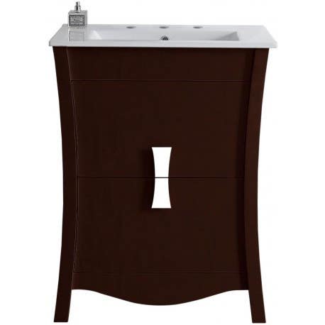 This modern vanity set belongs to the exquisite Bow design series. It features a rectangle shape. This vanity set is designed to be installed as a floor mount vanity set. It is constructed with birch wood-veneer. This vanity set comes with a lacquer-stain finish in Coffee color. It is designed for a single hole faucet.