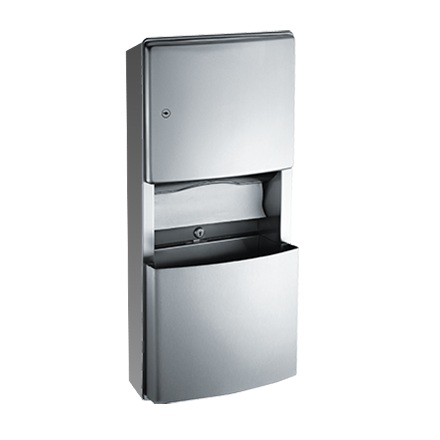 Dispenses 350 C-fold, 475 multi-fold paper towels. 3.0 gal. (11.2 L) removable stainless steel waste receptacle with a tumbler lock. 22 gauge type 304 stainless steel door in a satin finish with a flush lock and a heavy-duty 3⁄16" staked piano hinge on door.