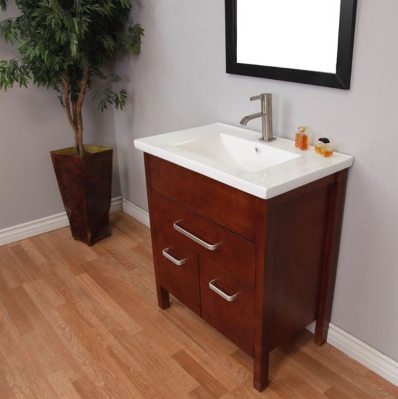 This Bellaterra Home bathroom vanity is constructed of solid wood. Features include a full size white ceramic sink with Functional overflow, brush nickel finish hardware, full extension drawer and soft close doors. This cabinet is an exquisite transitional design. Rich walnut semi-close finish ensures Waterproof on all surfaces. Use soft close hinges and full extension drawer glide that's durable for years to come.