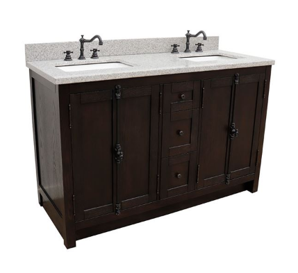 The Plantation collection by Bellaterra Home features Plantation Style bathroom vanities that can accomplish any home design. From the cottage to the cabin or to the grand home design, you will appreciate this beautifully hand crafted piece of furniture as the focal point in your bathroom. The Plantation style wrought iron finish hardware enhances the unique look of this piece of art. The vanity is made with solid oak and plywood, topped with ash veneer to give the texture. It is hand applied with multiple layers of ecofriendly stain and top coat to prevent pealing, cracking and fading. The interior finish is consistent throughout and matches the exterior finish. The structure of the cabinet is built with solid oak and has full corner block on all corners for stability and to also provide additional support for the counter top. It has one interior adjustable shelf for storage and a big opening for plumbing installation. This collection offers a variety of finishes. Each cabinet is configured to work with our variety of countertops or any standard sized tops. This vanity is available in: Brown Ash (Dark brown), Glacier Ash (White), Gray Ash (Light gray).This elegant bathroom vanity top features a 1.3e thick genuine stone top preinstalled with a white cUPC certified ceramic sinks and a matching backsplash is available for additional purchase for utmost beauty and functionality. It will easily match many home interiors. Our vanity tops are pre-drilled with faucet holes. Bellaterra Homees counter tops are pre-sealed and polished for added protection. All genuine stone material has its variation of veining pattern and color; every top will be slightly different.