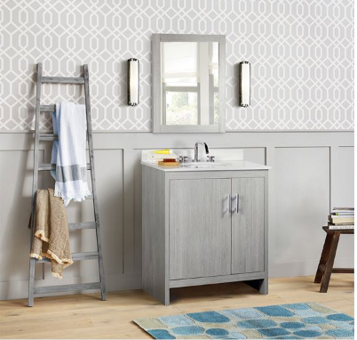 This beautiful modern vanity will make an incredible statement in your bathroom with its clean simplicity. This sleek single sink vanity is made with solid birch in a gray pine finish & properly sealed to stand against bathroom humidity. The double doors provide generous hidden storage for towels and toiletries and the concealed 6" deep drawer for extra storage. This elegant bathroom vanity top features a 1.3e thick White Quartz preinstalled with a white undermount cUPC certified oval ceramic sink and a matching 4 in. H. backsplash is available for additional purchase for utmost beauty and functionality. It will easily match many home interiors. The vanity top is pre-drilled with 3 holes for an 8e widespread faucet and fits directly on top of a standard vanity cabinet (sold separately). Bellaterra Homees counter tops are pre-sealed and polished for added protection. All genuine stone material has its variation of veining pattern and color; every top will be slightly different. Faucet and mirror not included.
