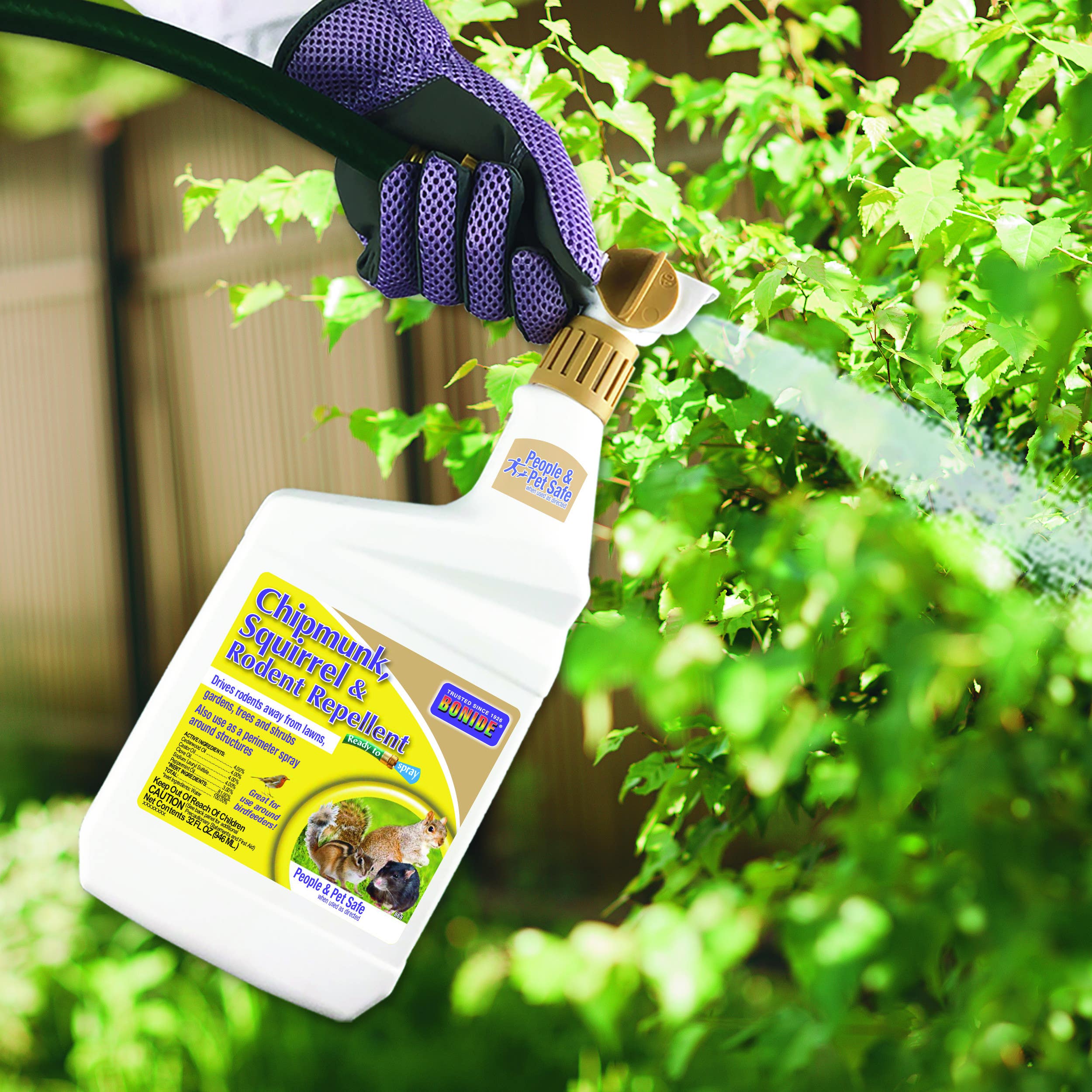 Deter chipmunks, squirrels, mice and rats from your lawn & garden with Bonide Chipmunk Squirrel & Rodent Ready-to-Spray Pest Repellent. A special blend of naturally derived ingredients and essential oils naturally repel rodents away from your yard. This product produces a powerful scent and taste that is naturally irritating to rodents, driving them away without causing harm to the animals.