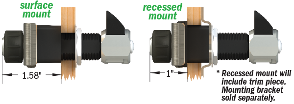 ecoForce is available in two mounting styles: surface mount and recessed mount. Surface mount requires ¾" diameter mounting hole with secondary attachment point for new or retrofit installations. Recessed mount requires installer to remove material from door/drawer to install — see illustrations below.