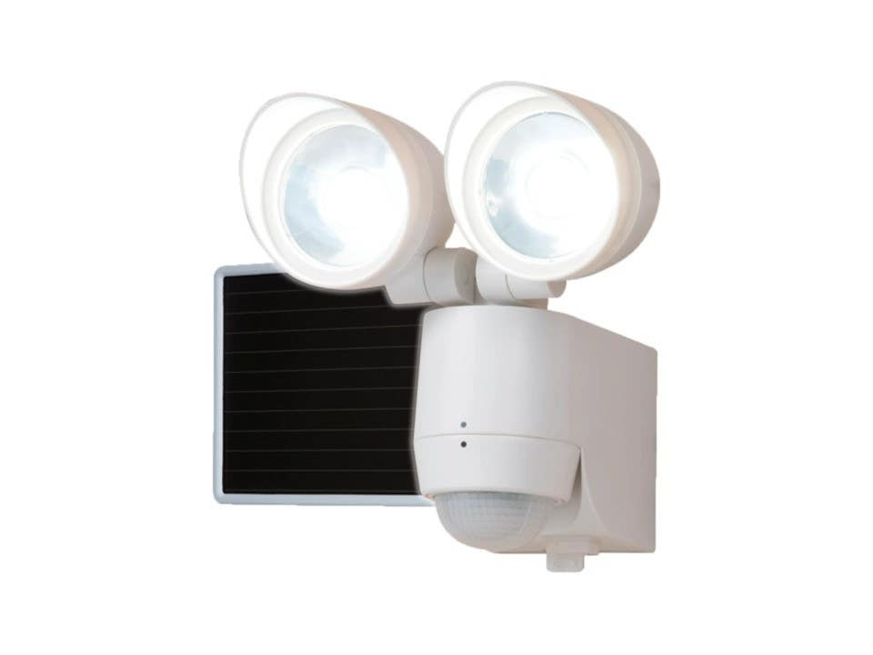 Solar powered LED twin head motion activated light with 130 degree of motion coverage. Compact design can be used in a wide range of applications.