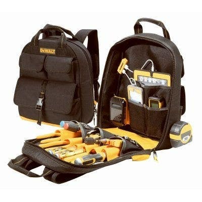 DeWalt USB charging tool backpack. Features a USB charging dock that can simultaneously charge 2 devices via USB ports along with an integrated 200 lumen, 2 level led light system. Powered by dewalt 20v max lithium ion battery (not included), 3 internal charging wall pockets fit tablet, phone, and/or camera while they are stored in the internal charging compartment. Powerful 200 lumen light with an adjustable steel neck can be used to light up the bag contents or illuminate your work area, 20 multi-use pockets inside and 3 outside help organize a wide variety of hand tools, padded web carrying handles and adjustable shoulder straps for comfortable and convenient hands free transport, battery not included.