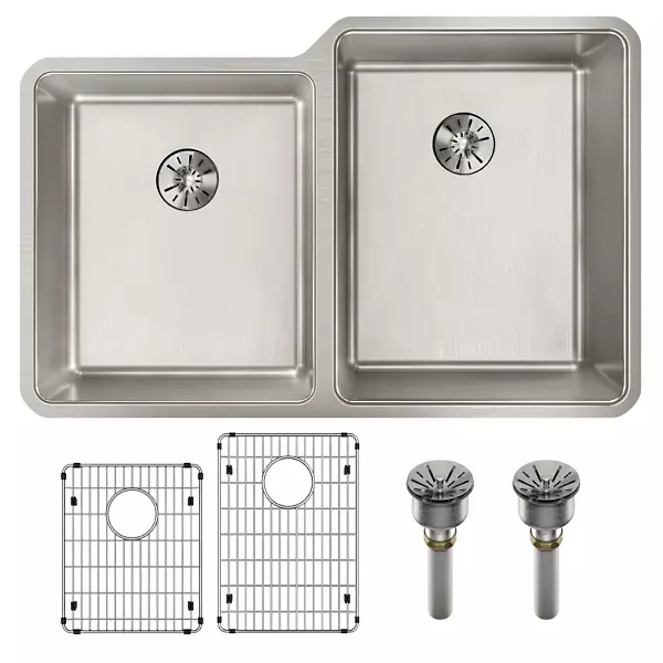 Details: Elkay ELUHH312 Lustertone Iconix Stainless Steel 31-1/4" x 20-1/2" Double Bowl Undermount Sink Kit w/ Perfect Drain