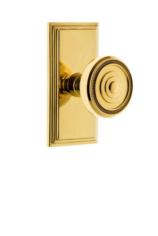 The Carre plate and Deadbolt, with their clean parallel lines and uncomplicated shape provide endless versatility. Add the unique drum-shaped Soleil knob, with its corona of vivid lines emanating like the sun, to bring a dynamic boldness to any room. All Grandeur products are created from solid (not plated) forged brass.
