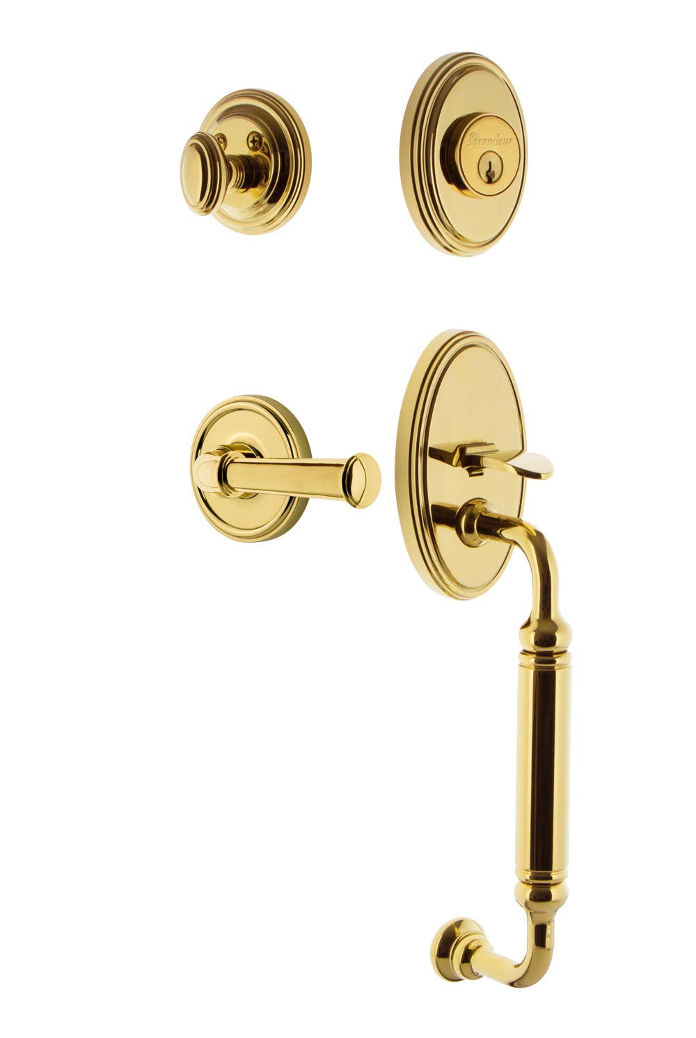 Universally chosen as an expression of tasteful elegance, the Georgetown Handleset, Deadbolt and Rosette captures a discrete, yet stately look. Add the Georgetown Lever, with its gracefully curved contour for an unmatched combination. All Grandeur products are created from solid (not plated) forged brass.