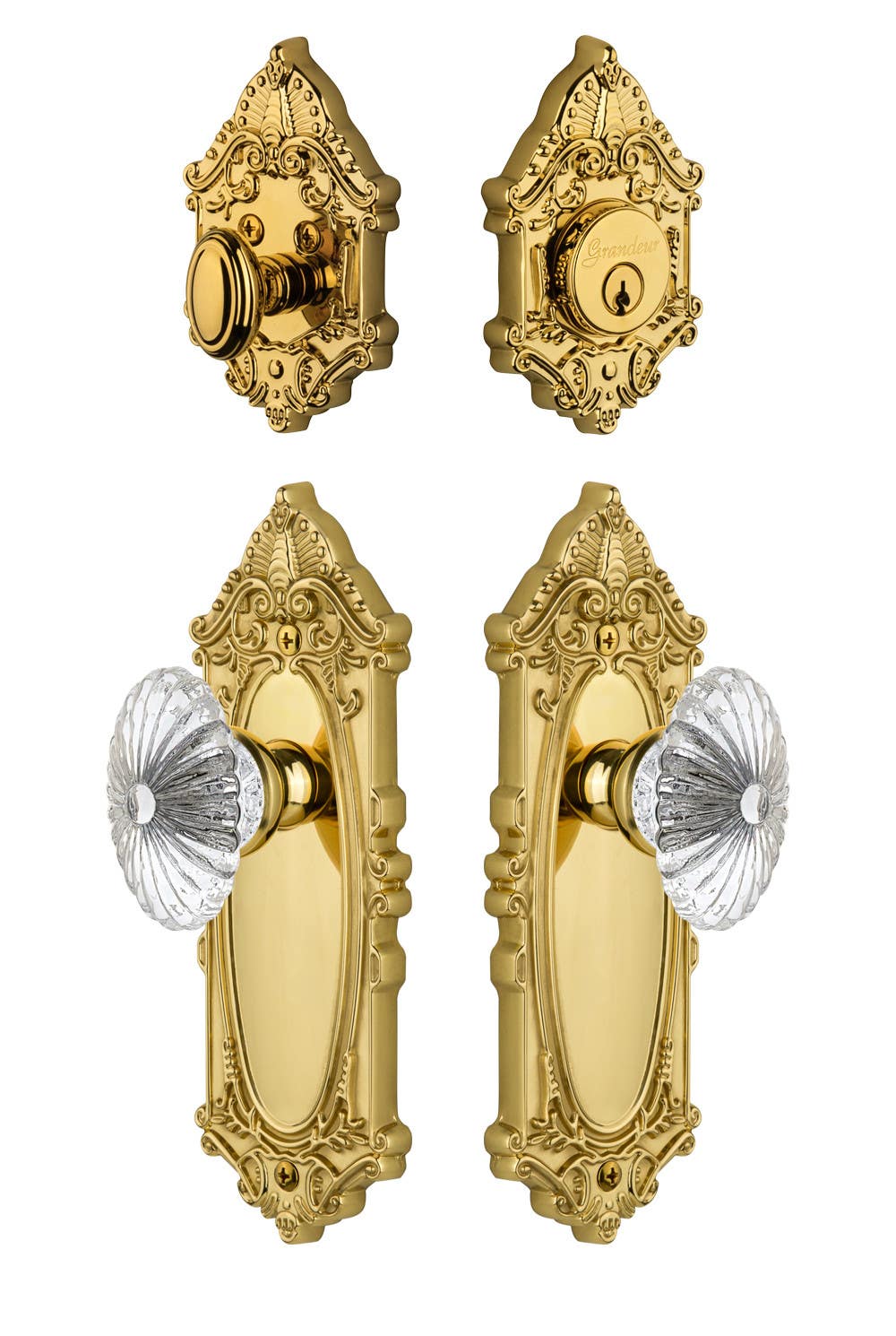 Define your home's exquisite appeal with the ornate authenticity and impassioned design of the Grande Victorian Plate. Add the Burgundy Knob and Grande Victorian Deadbolt, and achieve a dramatic combination. All Grandeur knobs are created from 24% lead crystal for unparalleled clarity and beauty, and mounted on a solid (not plated) forged brass base.