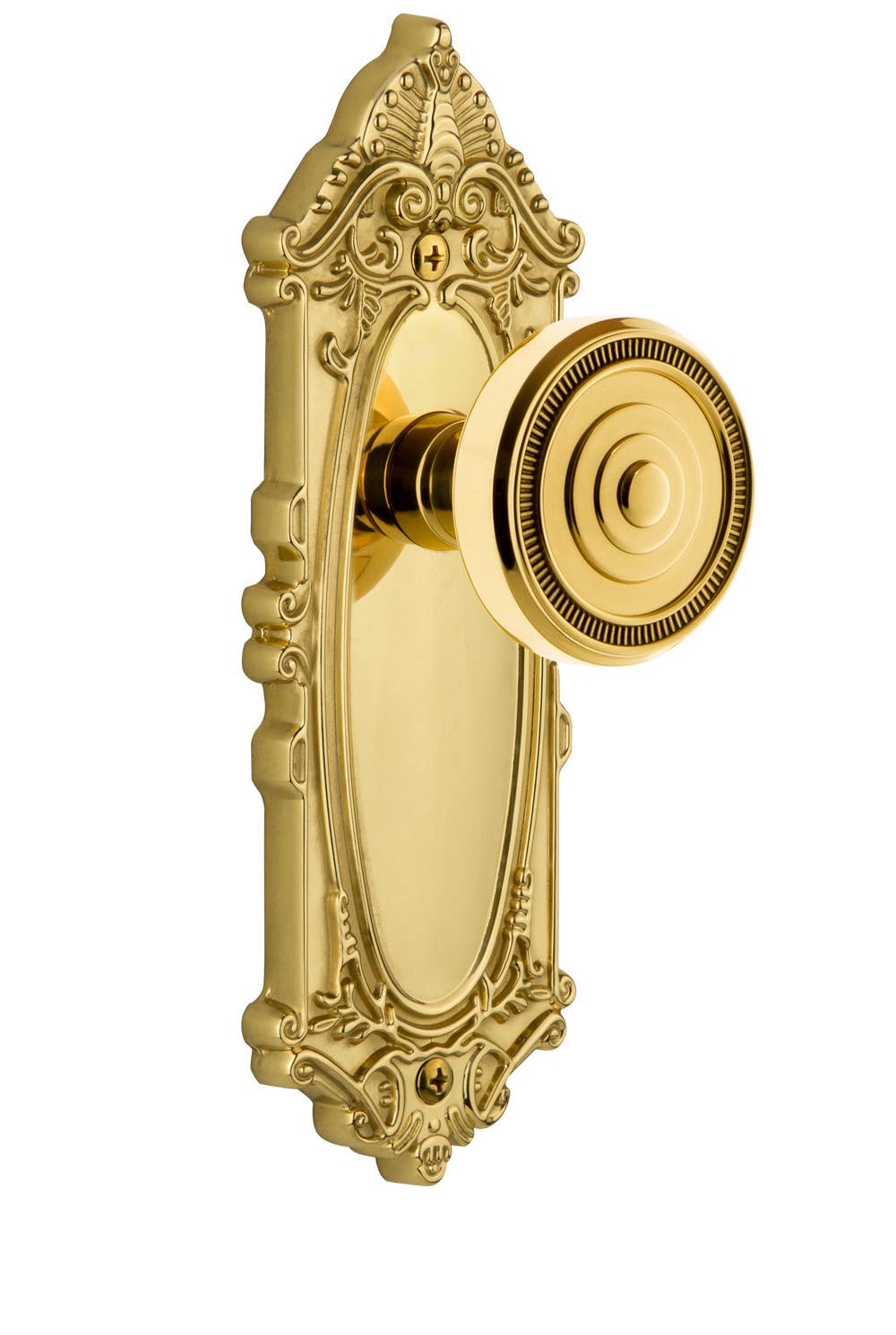 Define your homes exquisite appeal with the ornate authenticity and impassioned design of the Grande Victorian Plate. Add the unique drum-shaped Soleil knob, with its corona of vivid lines emanating like the sun, to bring a dynamic boldness to any room. All Grandeur products are created from solid (not plated) forged brass.