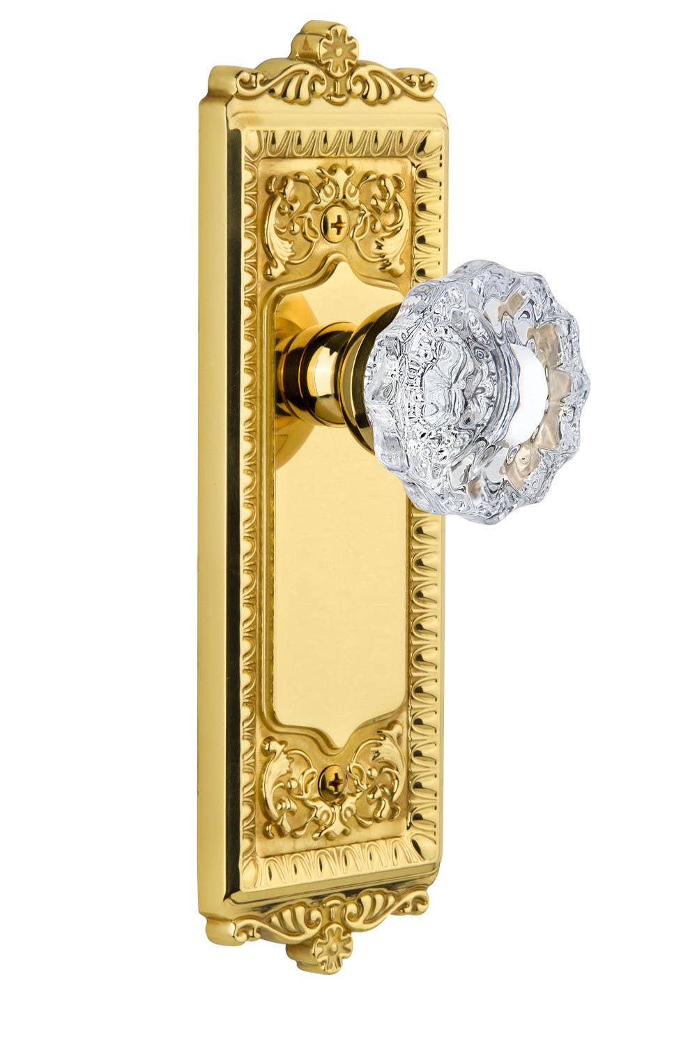 The Windsor Plate came into its current form from the neo-classical architecture made famous by Thomas Jeffersons Monticello and the royal Windsor estates in England. Pair this with our Versailles knob, with its smooth center and fluted edges, for an eye-catching look. All Grandeur crystal knobs are created from 24% lead crystal for unparalleled clarity and beauty, and mounted on a solid (not plated) forged brass base.