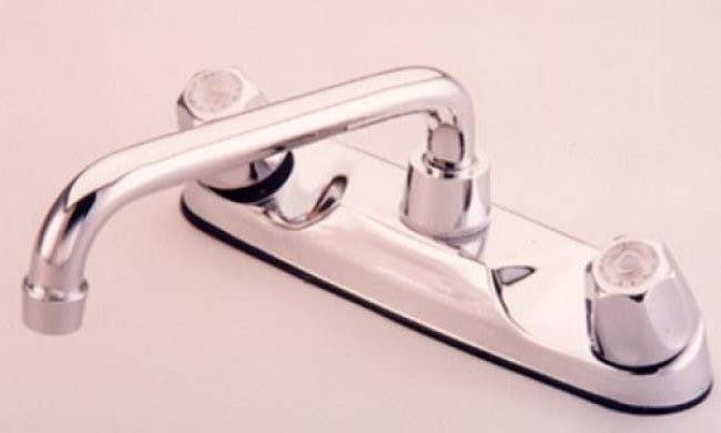 This double handle kitchen faucet includes a 8" centerset setup with a 360-degree turn 8" spout. The faucet also has a 1.8 GPM / 6.8 LPM Max at 60 PSI. Fabricated in solid brass for durability and reliance, the finish is made of polished chrome for corrosion and tarnishing resistance. A 10-year limited warranty is provided to the original customer.
