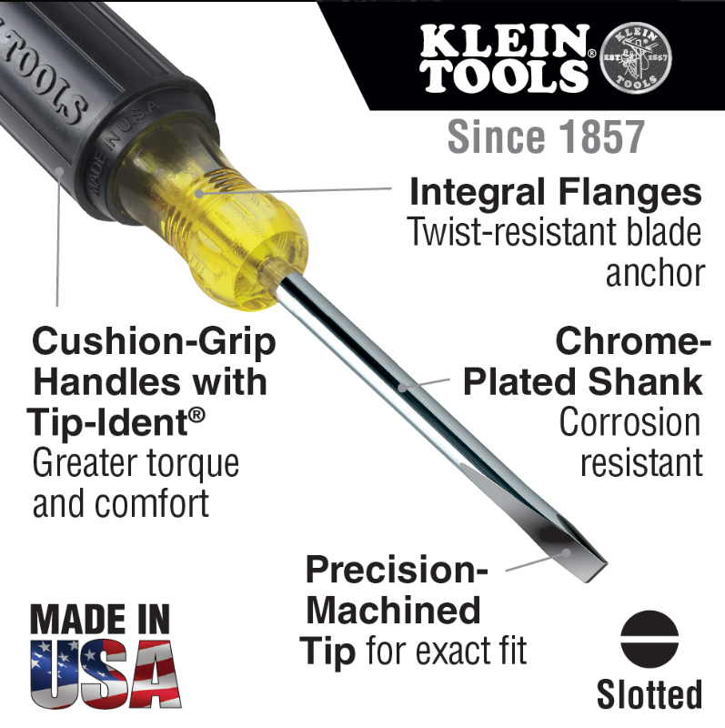 Klein Tool's 5/16-Inch (8 mm) Keystone Screwdriver with 6-Inch square shank is designed for the most demanding uses. It has a Cushion-Grip handle for greater torque and comfort. Meets or exceeds applicable ASME / ANSI specifications and has Tip-Ident that quickly identifies the screwdriver type and tip orientation.