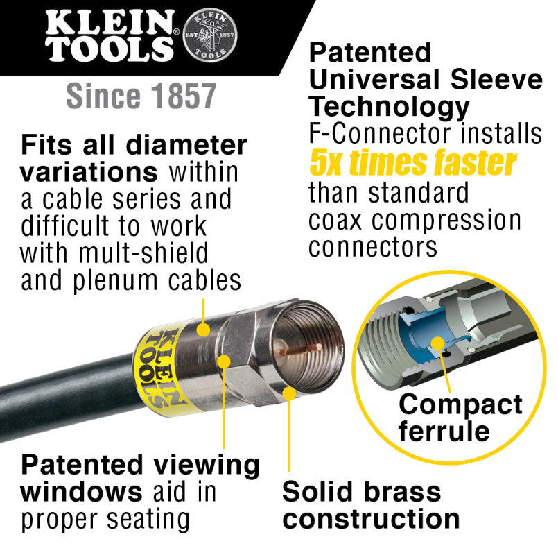 The Klein Tools Coax Installation Kit has the tools you need to prepare and connect coaxial cables with F-connectors. This kit includes a Klein Tools compact compression crimper, a 2-Level radial stripper, a multi-cable cutter, and 6 F-connectors. It also comes with a custom zipper bag.