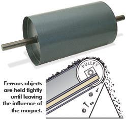When material passes over the pulley, ferrous metal objects are attracted by the magnetic field and held tightly as the belt travels around the pulley are not released until they leave the influence of the magnet. Non-magnetic materials follow a normal trajectory. A divider plate can be installed to ensure that no remixing occurs. Standard diameters range from 6" to 36," and standard widths range from 10" to 62." Shaft size depends on length and weight.