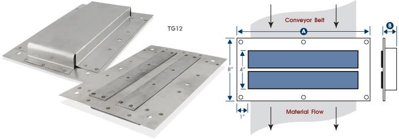 Can be installed in chutes or suspended above conveyor belts and pulleys for low volume, lightweight and/or slow-moving applications. These standard ceramic plate magnets are available in single gap design, and are offered in 1 inch thick (standard) or 1.5 inch thick (heavy duty) models. Also available with powerful rare earth magnets. Call us for more details.