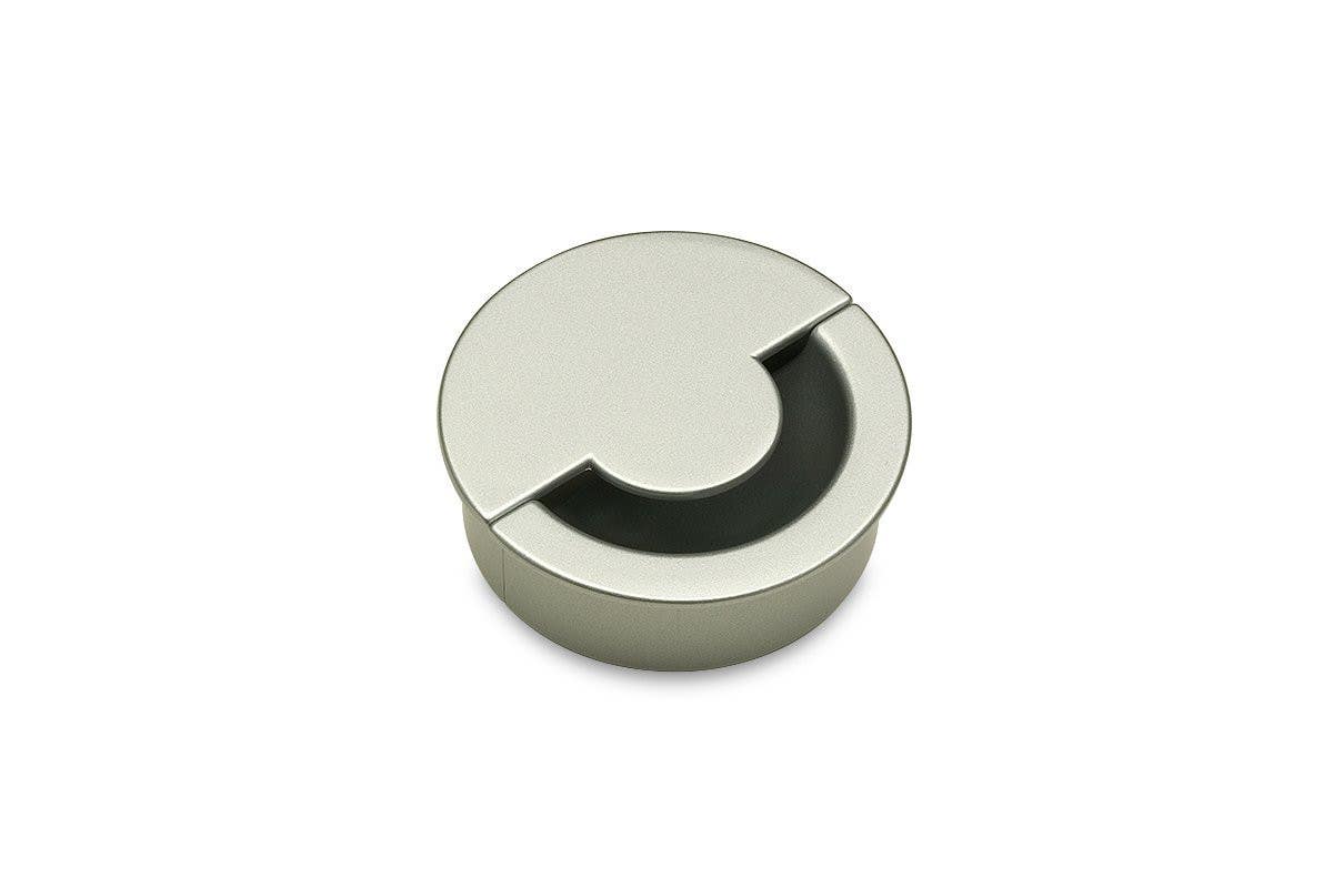 A two-part metal grommet with a happy face and a subtle design. Place wires through hole, then slide grommet halves around wires and into the hole.