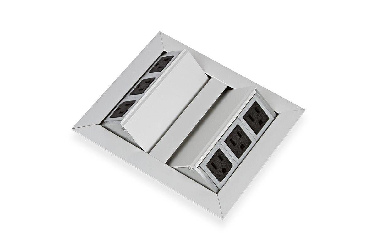 Dual-sided flip-up power grommet brings convenient power access to the surface level and allows access from both sides, perfect for conference room tables, training tables and libraries, or any other place a group meets. Press the lid to open for access to three power receptacles rated 15A/125VAC on either side, for six total. Then gently press down to "click" closed nearly flush with the surface when not in use.