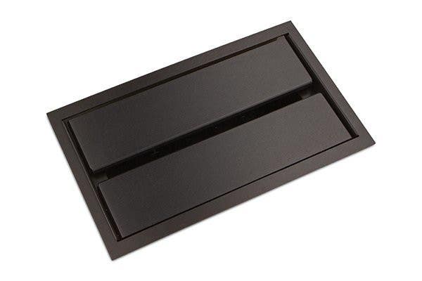 Two aluminum doors recede into the table to open and meet in the center to close with a gap in the middle to allow cords to be plugged in while the unit is in use.