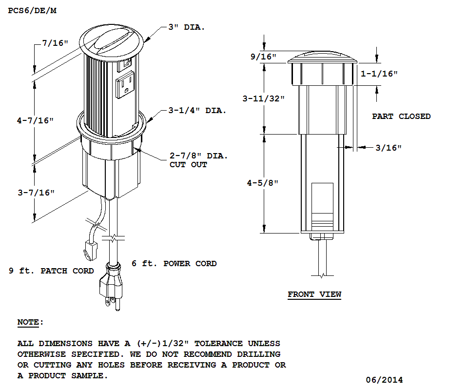 PCS6 sits subtly, almost unnoticed, on the desktop until needed. Then, just pull all the way up by the handle until snug, ready to use with power and data. Standard configuration is one electrical outlet rated 15A/120VAC and one Category 5e data insert.