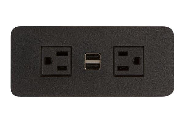 Flat panel sits nearly flush with the surface with two electrical outlets rated 12A/120VAC and a 2.1A dual USB charger. Charge up to two mobile devices at once, including phones, iPads, or tablets while still freeing up the outlets for other devices. Soft, rounded corners and extremely low profile make this a perfect addition to virtually any surface. Adjustable mounting brackets slide up against the underside of the surface on either side to secure into place. Reverse facing outlets offer access from both sides and can accommodate large plugs and power adapters.