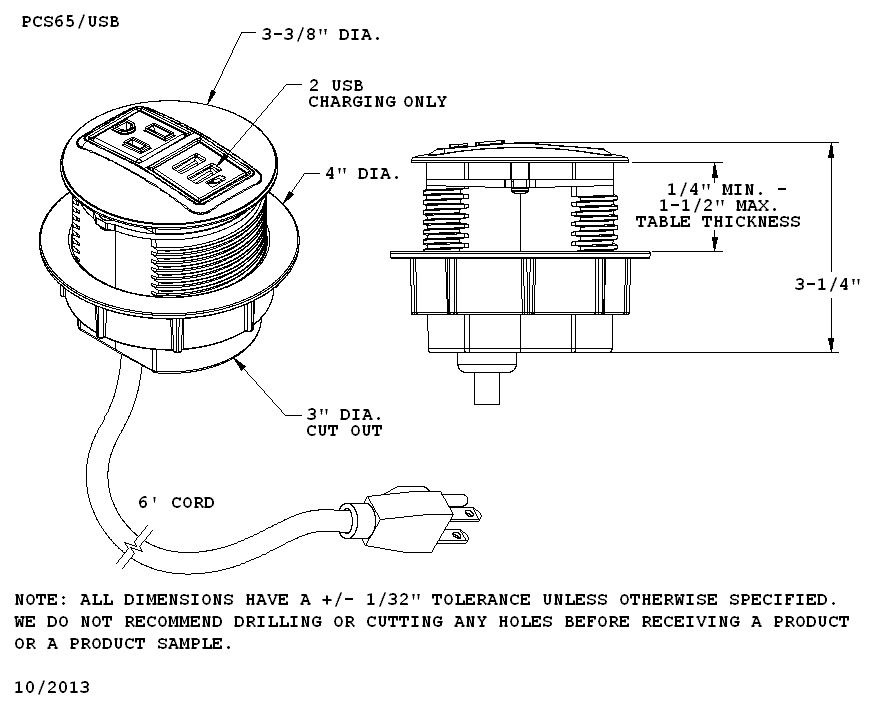 Powered USB charger can charge up to two mobile devices at once, thus freeing up the additional power outlet for use with other devices. The perfect addition to any workspace or hospitality environment. Slim round design maintains a very low profile with the surface level, elevating a mere 3/8" above the desktop. Make the most of an existing 3" diameter hole cut by incorporating power and USB connectivity rather than simple cable pass-through. Or add it to any surface with easy installation - simply drill a 3" diameter hole size, insert from above and hand tighten locking ring from below. Single power outlet rated 15A/125VAC and dual 2 amp USB charger. Plated or powder coat finishes available.