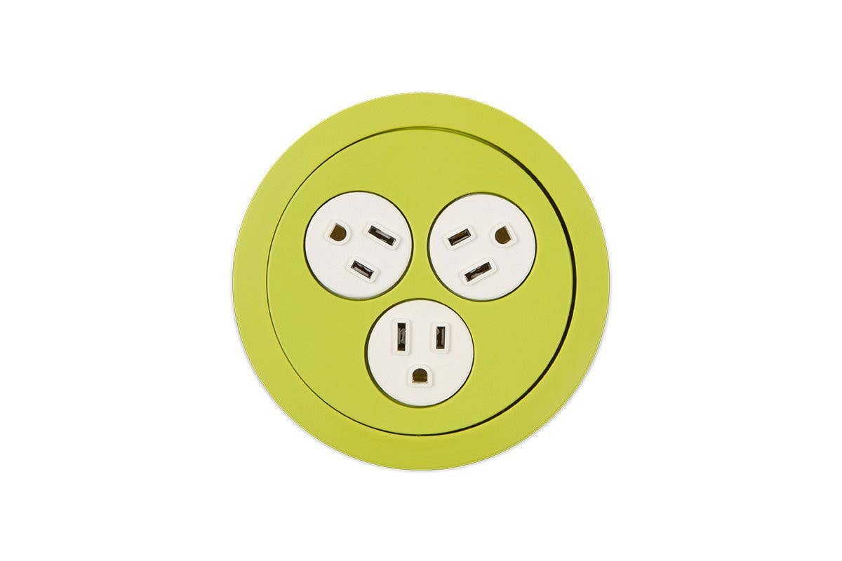 Recessed grommet mount unit rotates over to reveal three power outlets rated 15A/125VAC, and then flips back to a blank top in the closed position to conceal the outlets when not in use, all the while sitting nearly flush with the surface. Soft touch texture in four finish options make it as interesting to the touch as it is visually appealing, making a great overall accent piece for any type of furniture.