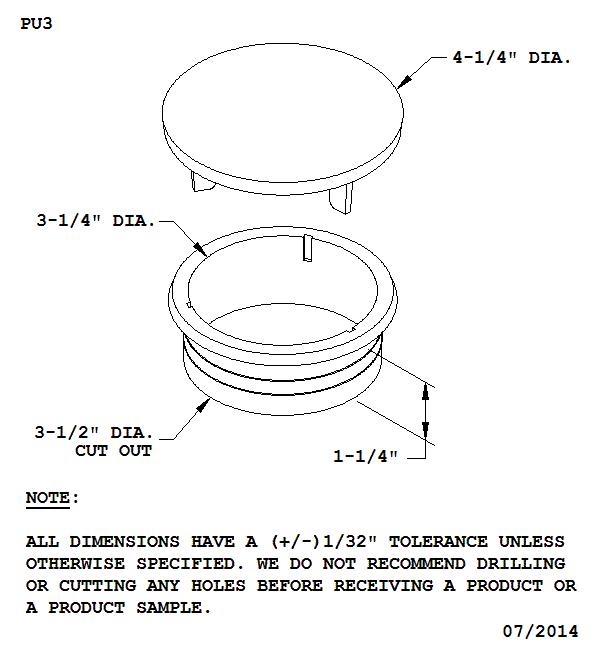 Size: 4 1/4" overall diameter, 3 1/2" diameter hole size, 1 1/4" deep.