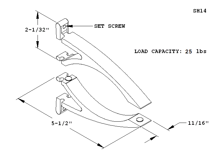 SH14 bracket stands out 5 1/2" from track and is suitable for shelves up to 12" deep. One bracket goes in facing up, its set screw tightened, the shelf goes on, the other bracket goes in facing down, and its set screw tightened.