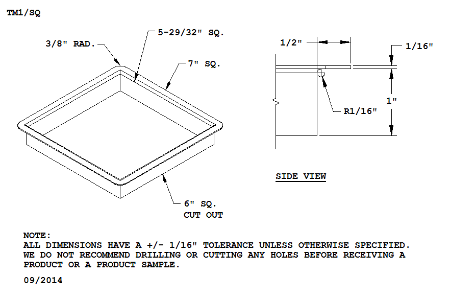 Size: 7" square overall; 6" sq. cut out; 1" deep.