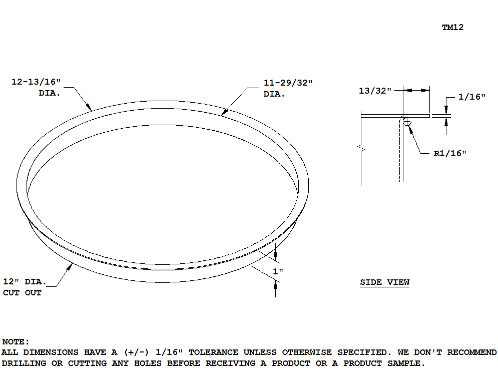 Tolerance: +/- 1/16".