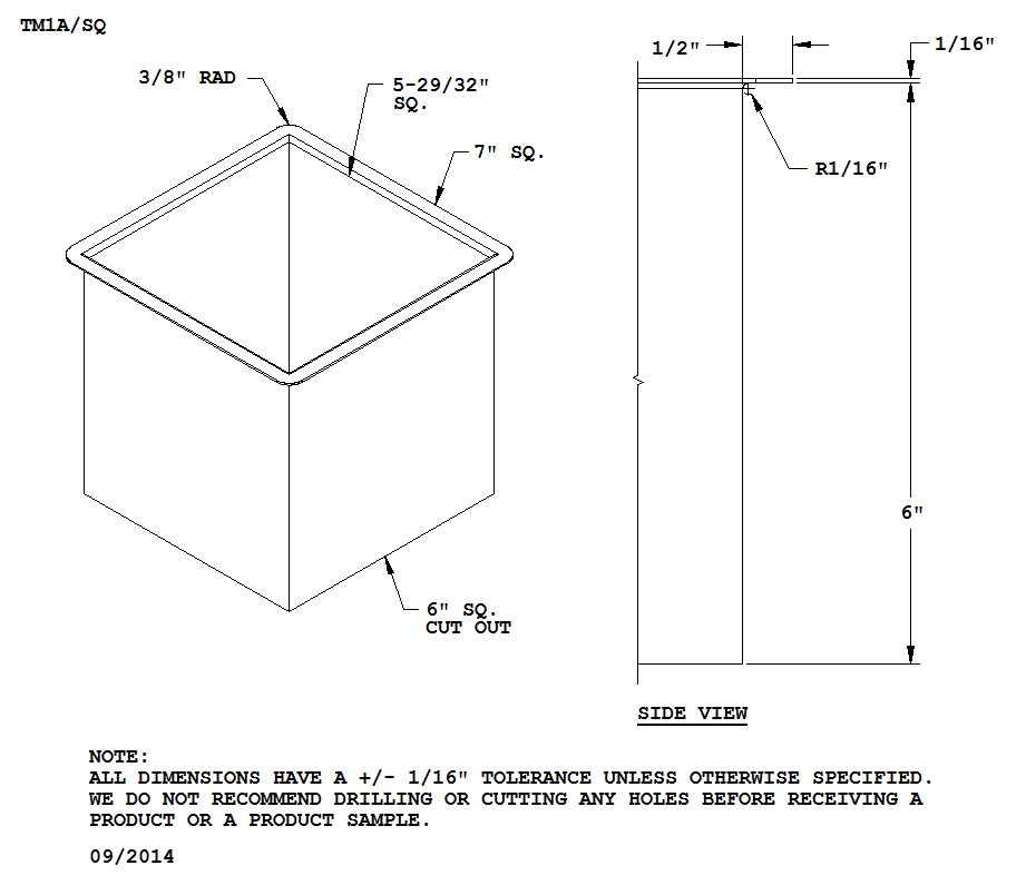 Size: 7" square overall; 6" sq. cut out; 6" deep.