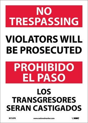 Prevent potential intruders from jeopardizing safety and security on the premises. Announce your policy of prosecuting trespassers via this bilingual no trespassing sign.