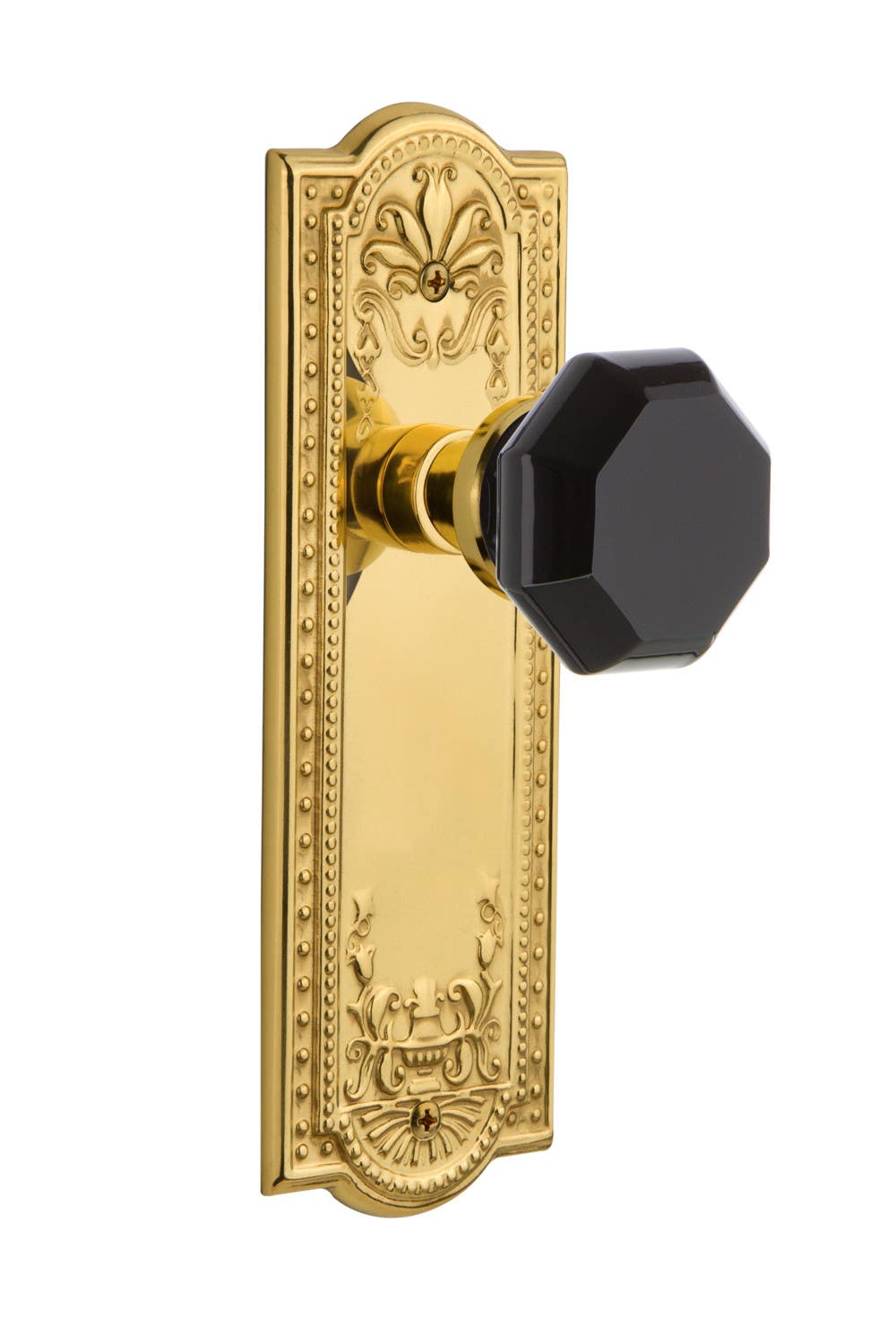The Meadows Plate, with its intricate beaded detailing and botanical flourishes, creates an inspired design theme. Pair this with our Waldorf door knob, and its crisp clean edges, for a lucent look. All Nostalgic Warehouse door knobs are mounted on a solid (not plated) forged brass base for durability and beauty.