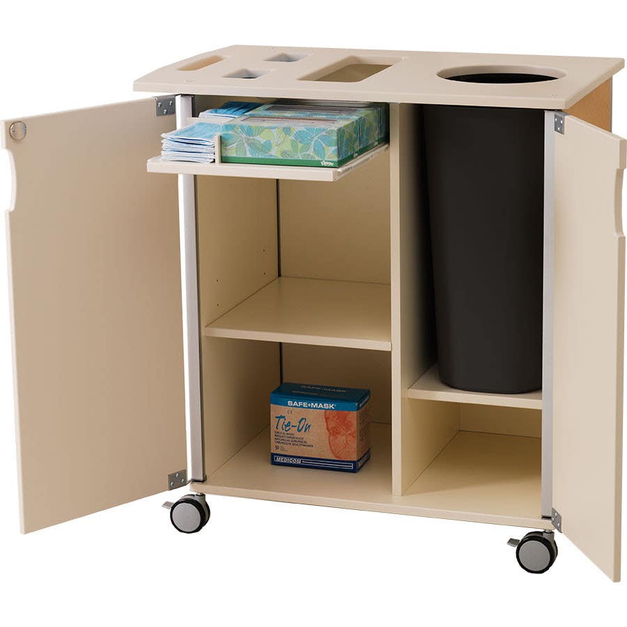 The organized Mobile Cart contains top dispenser openings and a sanitizer mounting bracket with drip dish. A pull out shelf and trash receptacle is located inside. Your choice of top, door and back panel finishes.