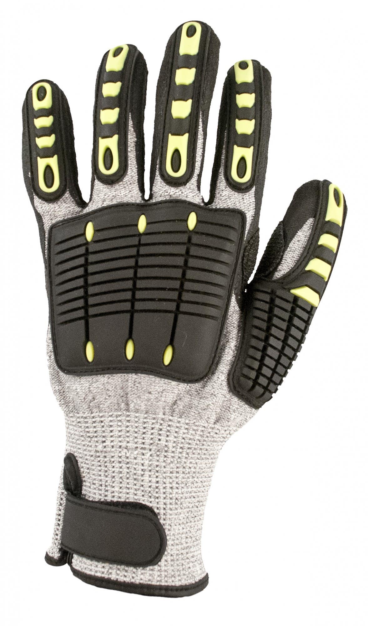 Combining comfort grip impact and cut resistance in a comfortable seamless liner. Flexible PVC impact pods for maximum durability. Reinforced thumb crotch. Suitable for heavy duty applications. Dimensions are 20" × 11" × 17"