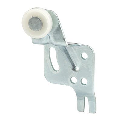This is a side mounted, top hung, adjustable wardrobe door roller assembly with a single 3/4 in. flat nylon wheel for the back door panel. The stamped steel bracket assembly is adjustable and has a 3/4 in. offset. It fits 3/4 in. to 1-3/8 in. thick doors. Used on Atlas closet door systems as well as a variety of other wardrobe door manufacturers. For other offsets see Prime-Line parts N 6626 or N 6627.