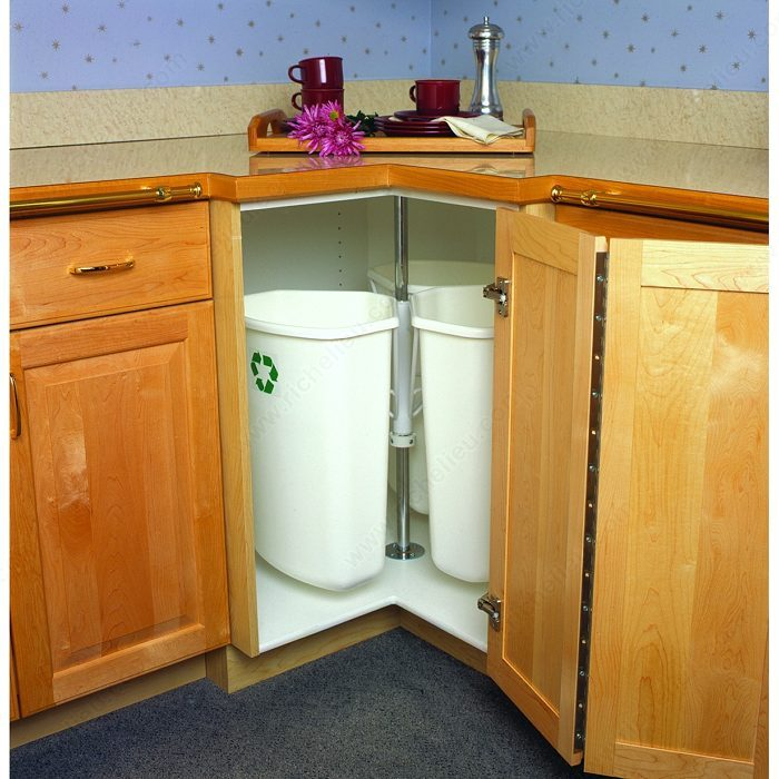 Increase the storage space of your corner cabinets with this recycling center. Three removable bins in white polymer rotate on a 1-inch diameter post. Each bin can hold up to 32 quarts.