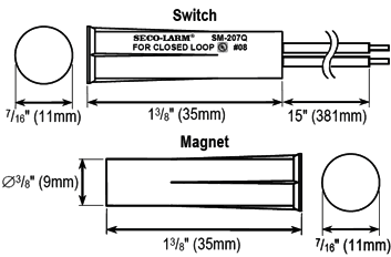 Details: SECO-LARM SM-207Q 3/8" Concealed-Mount Magnetic Contact, 1" (25mm) Gap, Closed loop, UL Listed