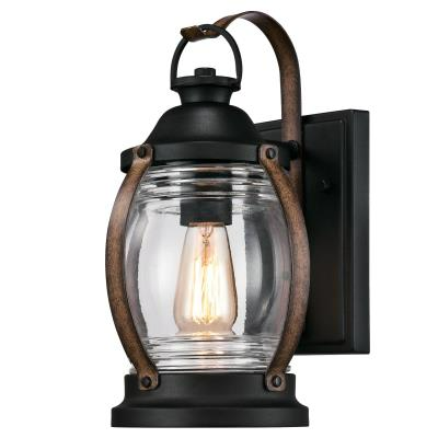 Details: Westinghouse 63351 Canyon One-Light Outdoor Wall Fixture, Textured Black, Barnwood, Clear Glass