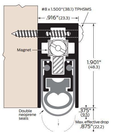 This Zero International #367 Surface Mounted, Heavy Duty, High Sound Automatic Door Bottom with a double solid neoprene seal offers the best sound control for high sound levels and will prevent infiltration of light, drafts and more. Made with high-quality mechanism that has been tested to 5 million opening and closings. Smoke and Fire-Rated and is available in various anodized finishes.