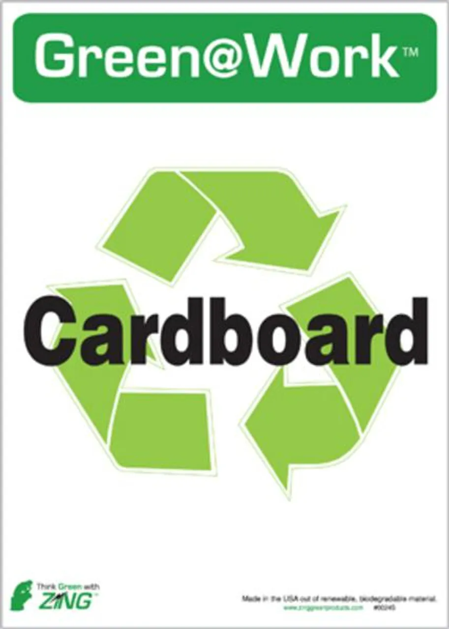 ZING Policy Sign, "Cardboard Recycling," promotes sustainable and efficient workplaces. The sign is made in the USA from rapidly-renewable adhesive plastic, and is available in three sizes, 7" × 5", 10" × 7", and 14" × 10".